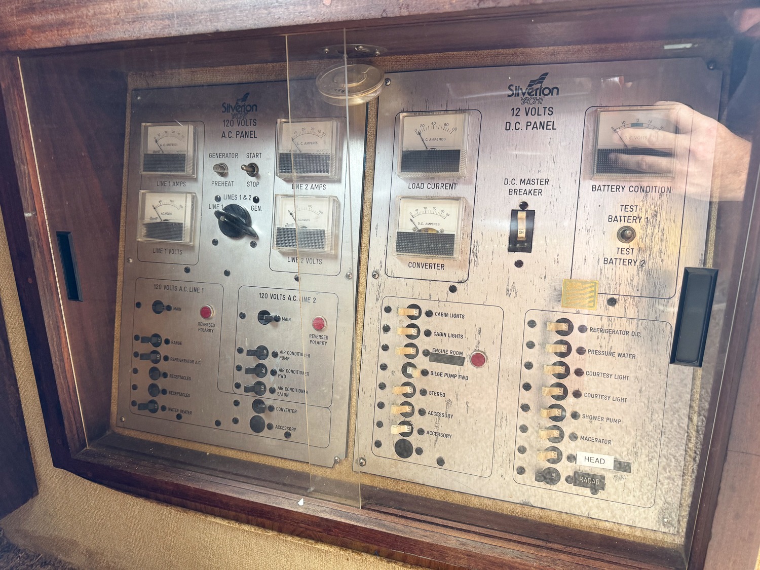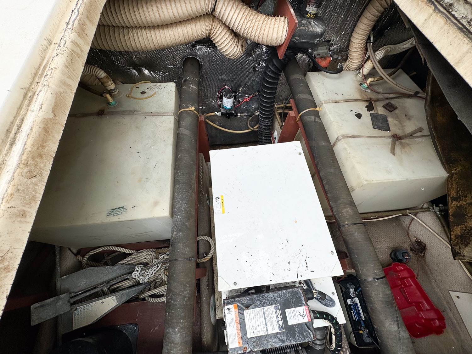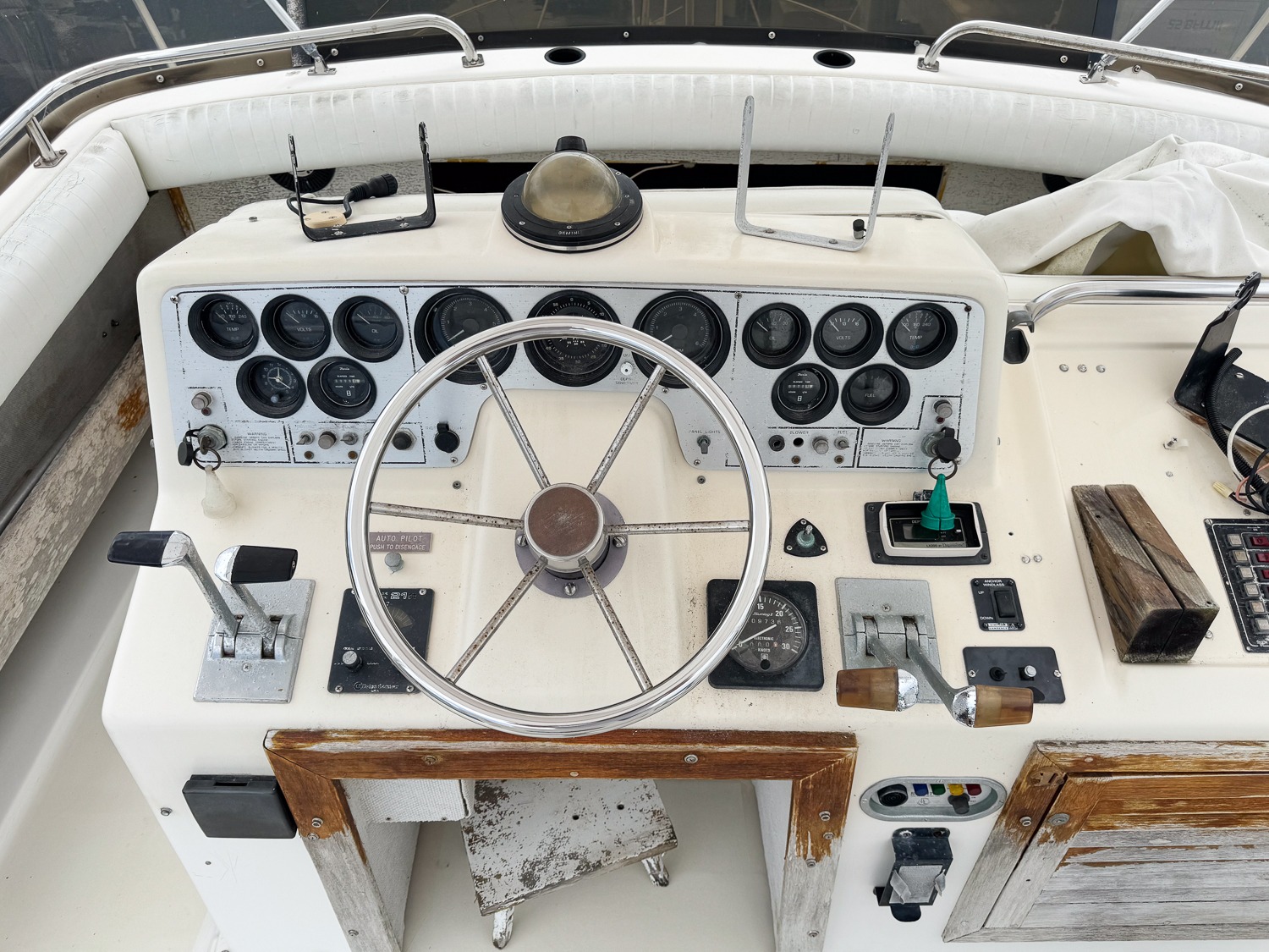 Powered by twin Crusader 454 inboards, both running, though the starboard engine has blow-by above 1500 RPM and needs a rebuild.