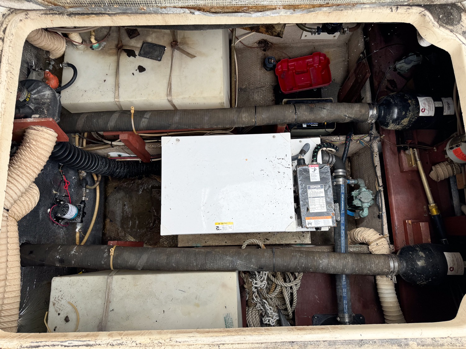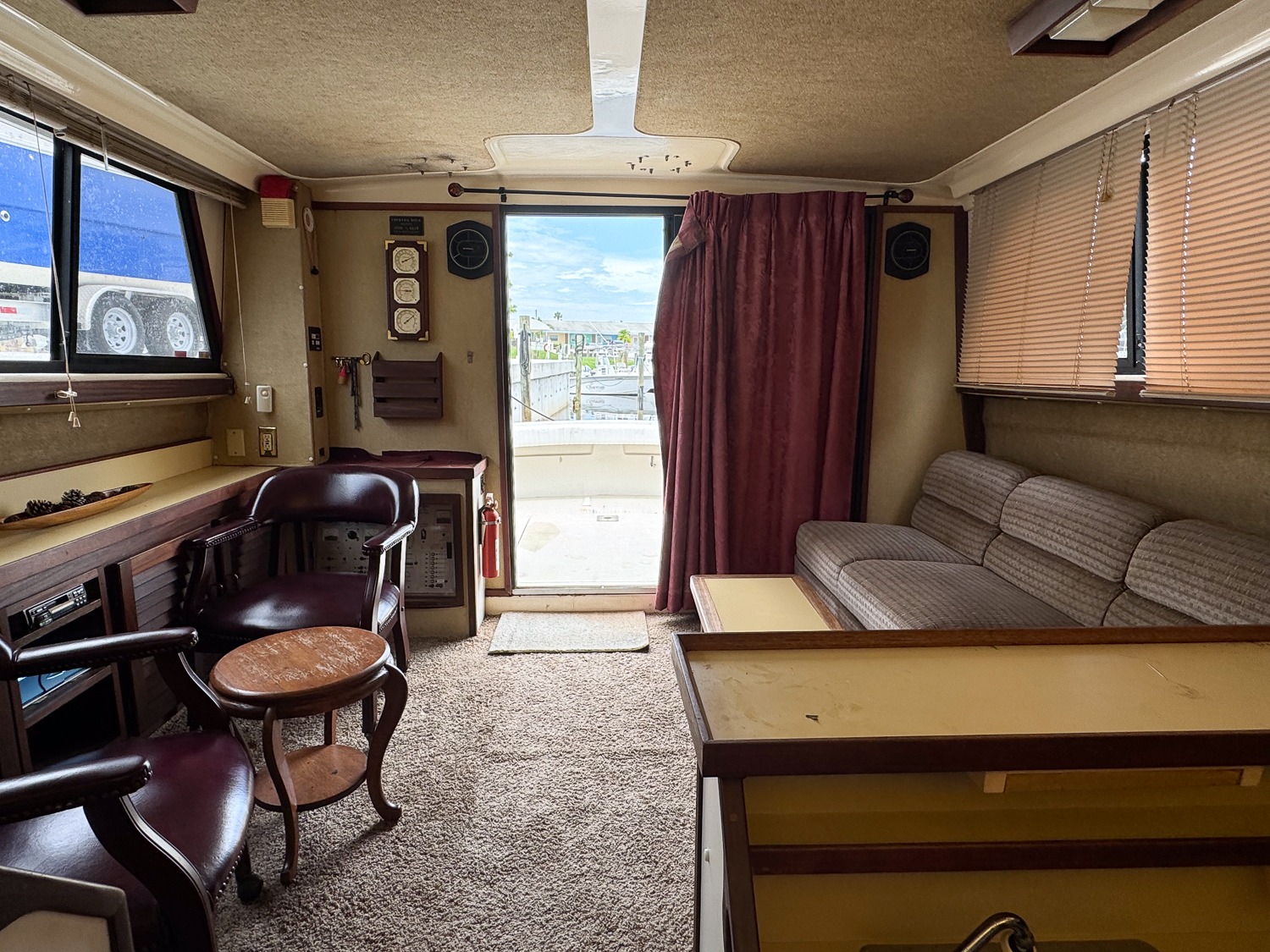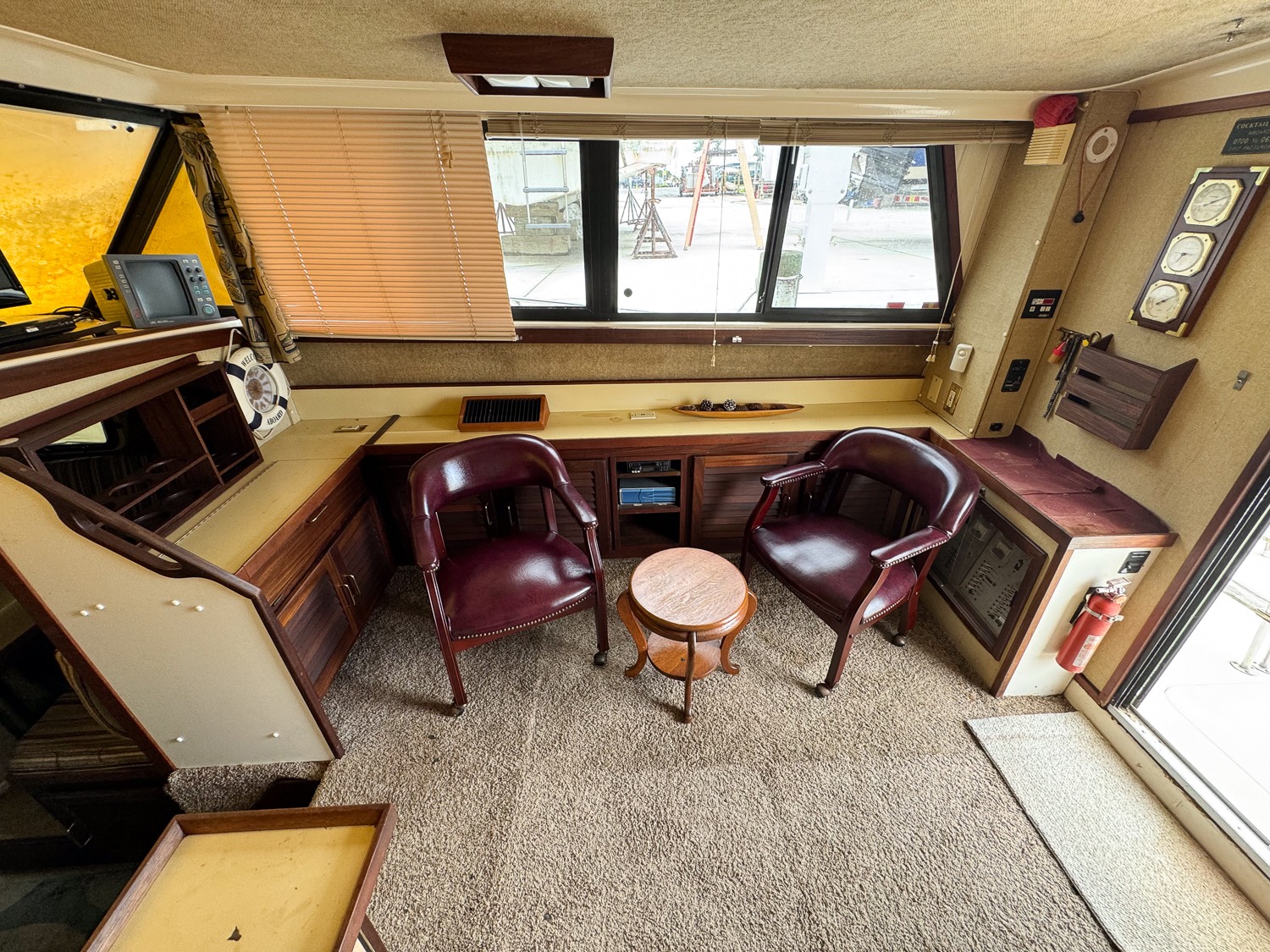 Powered by twin Crusader 454 inboards, both running, though the starboard engine has blow-by above 1500 RPM and needs a rebuild.