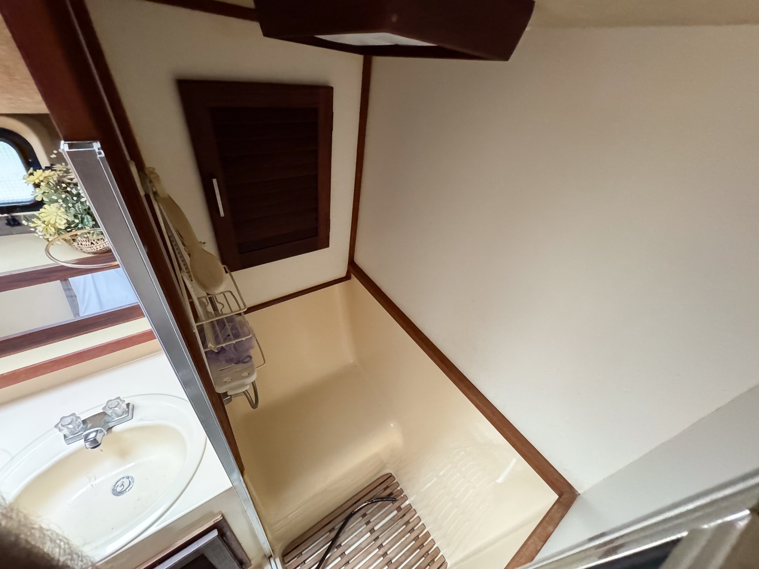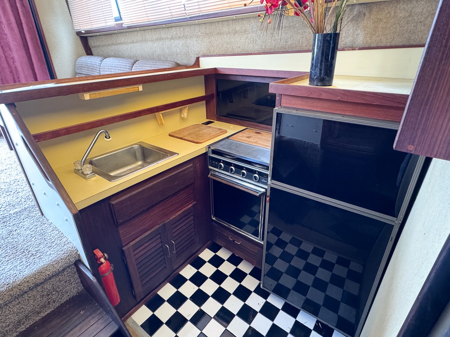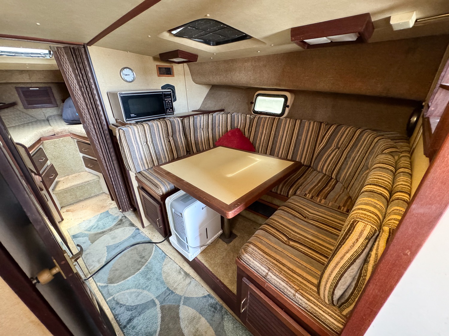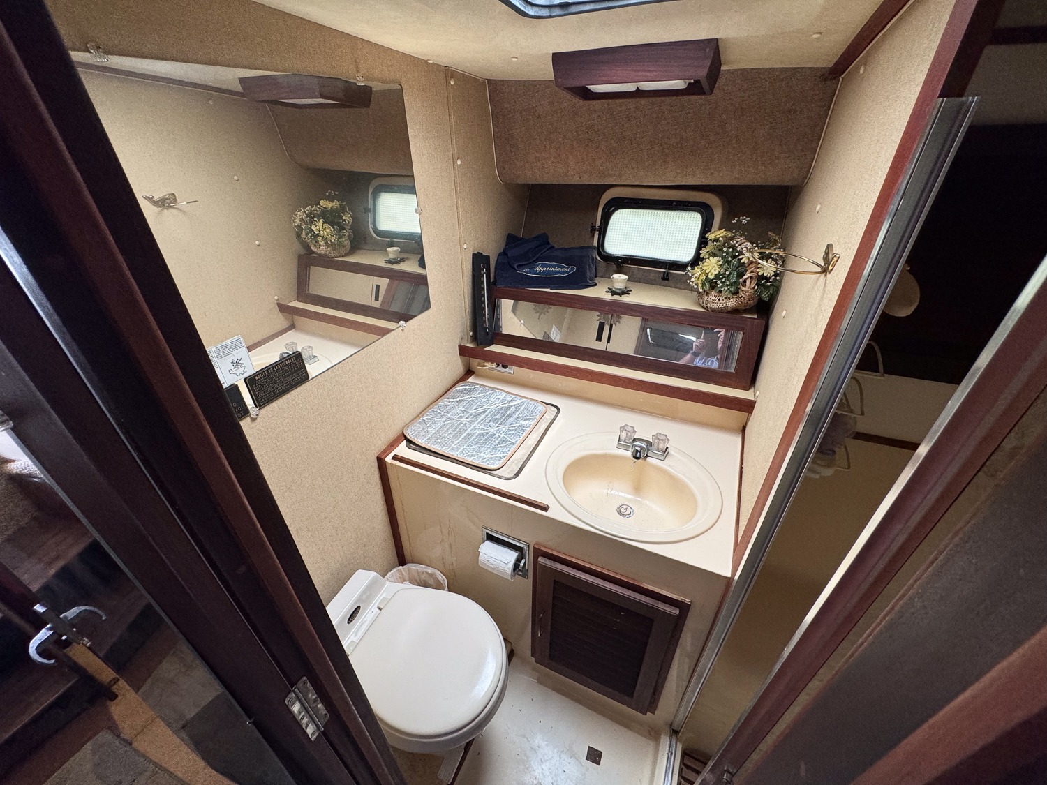 The spacious cabin includes a convertible couch, head and shower combo, and functional kitchen.